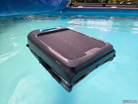 Qu’il vente, qu’il fasse 40 °C à l’ombre ou que les nuages s’accumulent, le Aiper Surfer S2 fait preuve d’une endurance remarquable. Sur plusieurs semaines d’usage dans un bassin familial fortement exposé aux arbres, aucune trace d’essoufflement. Le constructeur promet jusqu’à 35 h d’autonomie sur batterie pleine (sans recharge solaire), soit littéralement 3 à 4 fois la durée de son prédécesseur. Dans les faits ? Même avec quelques jours de pluie et un entretien intensif après un orage, la promesse est tenue.