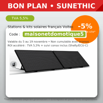 Du 5 au 19 novembre, Sunethic offre 5 % de remise sur l’intégralité de la boutique avec le code maisonetdomotique5. Le code s’applique sur tous les produits, hors articles déjà en promotion. Simple, direct, efficace.