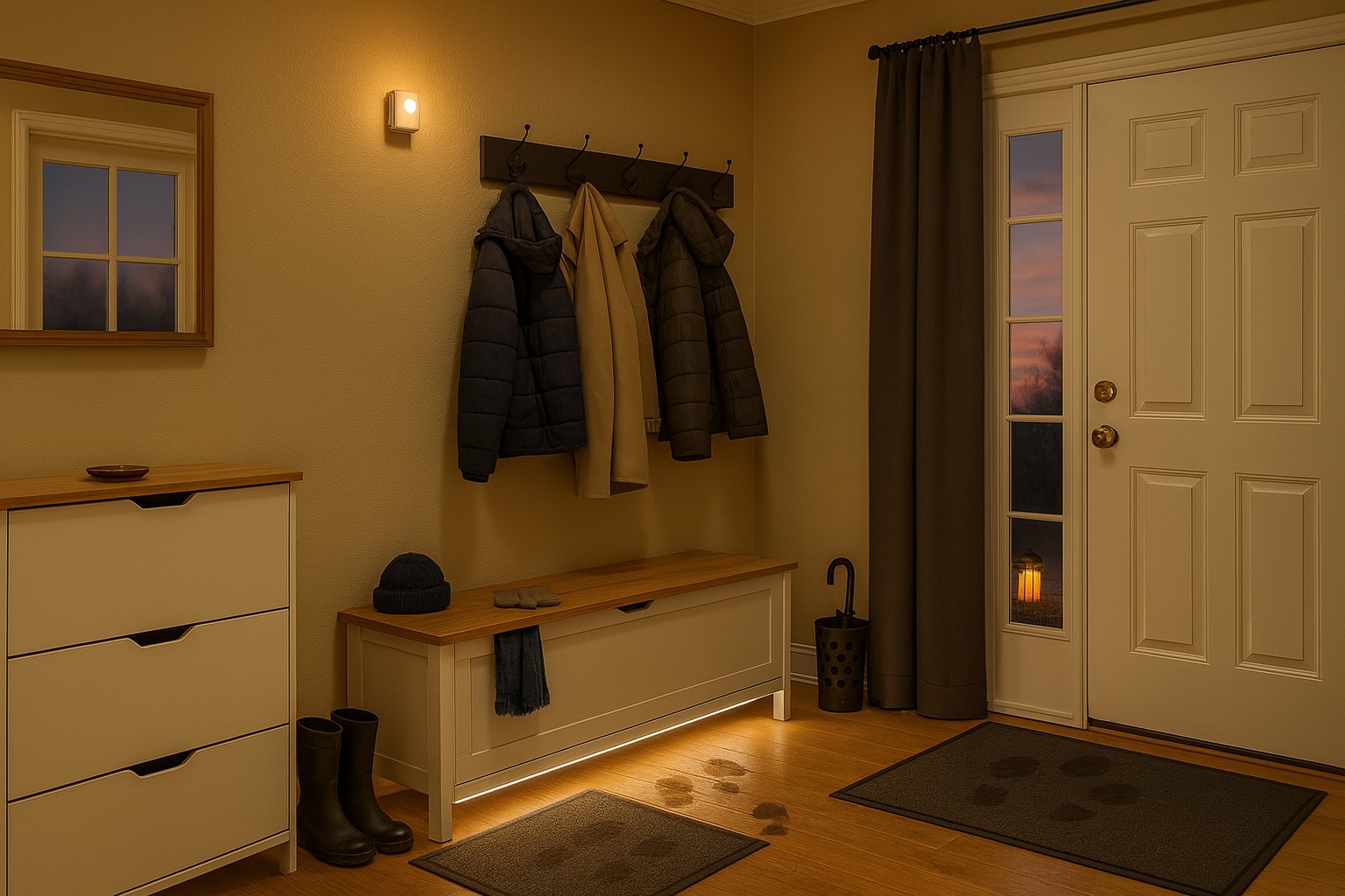 La meilleure entrée d’hiver est celle qui s’utilise sans y penser. Un éclairage automatique à l’ouverture de porte change la vie quand on porte sacs et doudounes. Une ampoule connectée ou un petit détecteur de mouvement dans un plafonnier suffit pour s’allumer dès qu’on franchit le seuil et s’éteindre après un délai réglable. La lumière chaude en 2700 à 3000 K crée une ambiance accueillante, atténue la froideur extérieure et aide à repérer les zones mouillées au sol. Dans les entrées profondes, une applique murale ou un ruban LED sous la console évite l’ombre portée des manteaux.