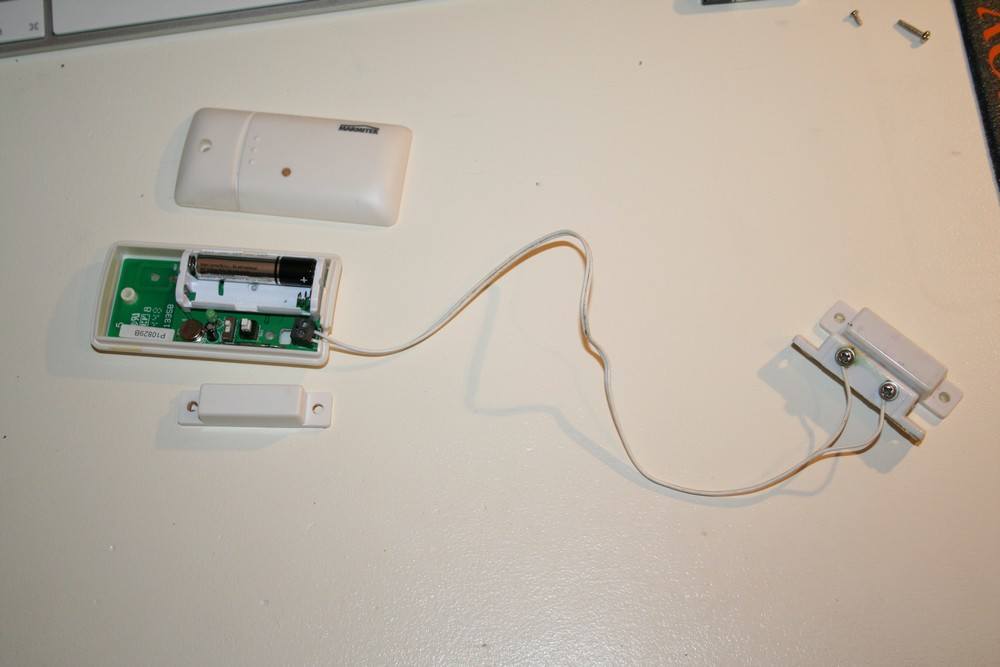 Ce qui nous intéresse est donc d’espionner la porte avant et le volet avant, utilisés par le facteur. Pour cela, j’ai simplement utilisé un DS18, que j’avais en trop avec mon alarme SC9100 (mais que l’on peut acheter séparément pour une quarantaine d’euros). Il s’agit d’un capteur d’ouverture de porte sans fil, alimenté par deux piles.